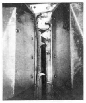 A sickle section bolts onto the right hand stripper plate for each row, and a wooden guide is placed behind the left hand gathering chain to force it farther out over the snapping rollers. As the sunflower stalk reaches the rear of the gathering slot, it runs into the stationary sickle section which cuts it off. The head falls into the cross auger and is fed into the combine.