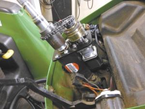This required that he piggyback electrical controls to the hydrostat and mechanical controls to the steering column. Foot pedals on the 4210 are equipped with position sensors that feed signals to the engine control unit. Laine spliced into the wires for power, ground, and fore/aft signals.