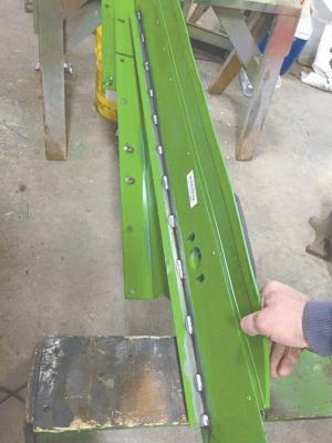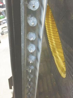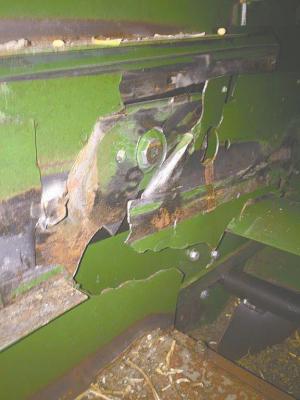 “I recently went through the sieve area on this combine. I took out the top and bottom sieves only to find all kinds of problems in this shaking area. All the damage pretty much starts in the same area on every combine because there’s a support ledge that holds the bottom sieve. The sieve lays on a piece of formed 14-ga. angle iron that’s spot-welded to the outside frame which is attached to the shaking mechanism arms. The sieve puts a lot of fatigue on this poorly welded ledge. The support ledge is welded along the bottom with no welds on the top. Because there are no welds across the top, it ‘peels’ away from the surface it is attached to, from the weight of the sieve and the shaking. Once it does that, the sieve drops to where it doesn’t belong and causes destruction to the whole back end of the combine. This repair typically costs about $10,000 to $15,000 in just parts, without labor. The solution to the problem is to weld along the top ledge. It’s easy to do and will save owners thousands of dollars in repairs.