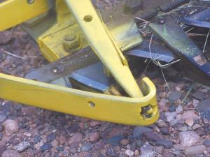 The guide is made from a 1 1/2-in. wide length of strap metal. Jaster drilled a 1/2-in. dia. hole near one end of the strap and used a dremel tool to grind a taper to the hole. Then he used a cutting torch to heat up the strap so he could form a bend around the sicklebar’s outer shoe point. The strap is held in place by an existing bolt that controls the position of the sicklebar’s adjustable sole plate.