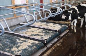 This moving free stall floor works like a treadmill to clean manure from free-stalls. The moving rubber floor mechanically rotates around a pair of rollers. As the belting moves, a stainless steel blade mounted underneath cleans it off.