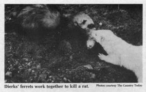 Dierks, and many of his neighbors, say ferrets make the ideal rat predator. The weasely little animal, with it's sharp, curved teeth and vice-grip jaws, instinctively runs down rats and goes right for the throat. It relishes the chase through tunnels and shed walls and under corn cribs and buildings. The trick is to teach the animals to kill and move on or to simply chase the rats out into the open where people with brooms and sticks can finish them off.