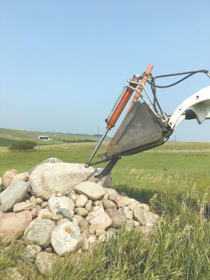 Barry Anderson’s skid steer attachment picks up individual large rocks, loads them into the bucket and when the bucket is full, piles them as high as the loader can go. Best of all, it requires no bucket or loader modifications.