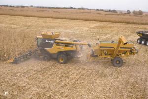 To configure the setup, Kreikemeier built a special hitch on the cart using 2 long pieces of 3 by 5-in. steel tubing and a single shorter 6 by 10-in. rectangular tube. The smaller tubing connects to the front drive axle of the combine and pulls the cart while the larger one connects to the rear axle under the straw spreader. Kreikemeier estimates this setup puts about 4,000 lbs. of tongue weight on his Claas 780 combine, which runs a 16-row corn head. The cart has its original 24.5 by 32-in. tires that follow in the same tracks as the combine.