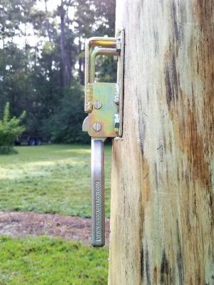 The Best Gate Latch consists of an upper catch latch and a hinged, 2-pronged fork attached to a rectangular steel base plate that bolts onto the post.