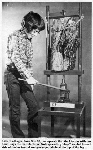 "In dry, easy-to-split wood, a man with an axe will probably split more wood in 15 or 30 minutes than someone using the Abe Lincoln sputter. But doing it with an axe is much more tiring and hazardous," explains Starks. "Even youngsters and grandparents can split a large pile of wood with the Abe Lincoln with a minimum of exertion. What's more, it's much safer to operate."