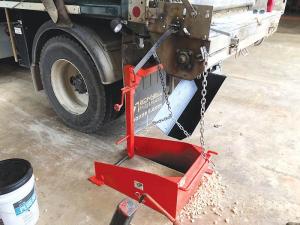 The dragbox hangs from a framework that is bolted to the frame of a dump truck equipped with an auger at the tailgate. When the box is in place, material is augered to drop into the “gravel” box. As it falls onto the road shoulder, the backside of the box strikes it off at the desired level. “The sides keep it restricted to the 18-in. width,” says Pierce. “Dumping to the left allows the operator better visibility of the box and better control over release of materials.”