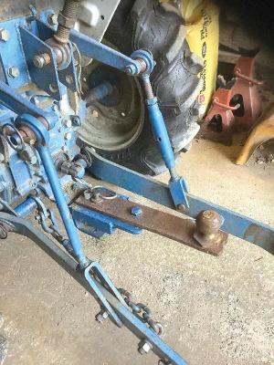 The hitch for the Ford tractor consists of a 1 1/2-ft. long steel bar with a ball bolted onto one end. At the other end, Reay welded 2 pieces of angle iron to a 6-in. long steel plate that he bolted to the bar. He also drilled a hole through the bar for a draw pin.