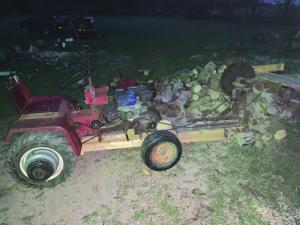 The 18-in. sawmill blade is belt-driven off the same shaft that drives the tractor’s belly-mounted mower. “When we were kids, my brother and I helped our dad use the saw to make firewood. My dad and brother fed logs into the saw, and I threw the firewood into a trailer made from an old pickup. We could fill it in 15 min.,” says Byrn. “Now Grubb uses the sawmill on his WheelHorse. The mill’s original mounting brackets didn’t fit his tractor, so he used 2 by 4’s to make a platform that extends several feet out in front of the tractor and mounted the blade on it. He cuts the wood into 6-in. pieces.