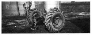 "I built it in the fall of 1985 which was so wet I couldn't get into fields to harvest," says Dodd. "It cost only $700 to build versus a commercial 4-WD hydraulic assist which would have cost $7,000. Since I installed the truck axle I've re-placed the combine's gear-driven trans-mission with a hydrostatic transmission. The combine's original rear axle did turn sharper and was lighter. To compensate for the wider turning radius I just make an extra pass along the ends of fields. When harvest conditions are dry I replace the Army truck axle with the combine's original rear axle."