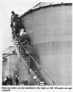 New Easy-up stairs come complete with a handrail and safety platform. They're reversible right or left and fit any standard bin with 32 in, high rings, explains Jim Miller, of Illiana Stir-Ator Co., Oakland, Ill.