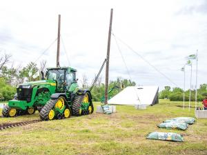 Everything was giant, from the 68 by 34-ft. board and oversized “bean bags” to the John Deere 8RX tractor that pulled back a bungee cord attached to two poles. Winners from a cornhole tournament took turns pulling the cord to release the bags, along with celebrities such as the Shark Farmer and the You Betcha Guy.
