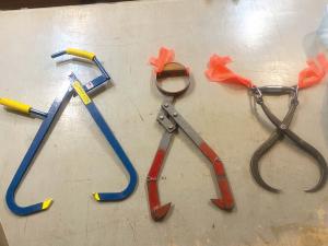 “My third log handler is my favorite and also the simplest. They were made in the early 1900’s and given to me by a friend. These log clamps have a contoured hand hold at the top with a chain link at either end that attaches to the pivoting tongs. What I like about these tongs is that I can pick up almost any log and toss it with minimal effort. They grab on to log chunks quickly and easily. All I do is sharpen the points occasionally. I doubt if anyone makes tongs like these anymore, but they should. They work great. I tie red plastic pieces on them so they’re easier to spot after I toss them on the ground.”