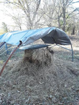 So, he removed the tarp and springs from the trampoline and pulled the frame apart into two pieces. He connected the four legs of each half with muffler clamps and tied a tarp over the top. It’s light enough to move around and there’s plenty of room for a big round bale. For further protection from the weather, he placed an old car hood on the bale.