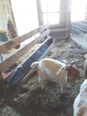 To feed his three does sweet feed, he bent a 6-ft. galvanized slide after placing a pipe in the middle to help shape a feed trough. The ends are pinched together, and to hold the sides apart he inserted all-thread rod inside holes drilled through short dowel pieces. He drilled holes in the sides of the slide and used nuts to secure the dowels in place.