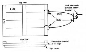 The sled consists of four 2-by-10 planks laid side by side, held together by three 2-by-4's running across the top of them. A 2 by-4 runner is attached to the underside of each side of the sled. The front of the sled is angled upward at a 45? angle. "The sled runs on the 2-by-4's most of the time, saving wear on the planks and making it easier to pull. The 2-by-4's need to be replaced periodically," Drake told FARM SHOW. He pulls the sled with a chain attached to the front of the sled.