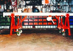 Jerome Behm had the perfect anvil for popping rivets in and out of a sickle bar. To make the long anvil, he mounted a 10 ft. length of railroad rail topside down on stationary legs. A second set of legs with caster wheels is lowered to raise the anvil/rail table for moving about the shop.