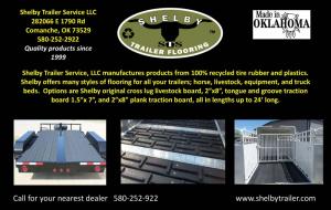 Rubber Lumber Flooring For Livestock Trailers LIVESTOCK Handling Shelby Trailer Service LLC manufactures products from 100% recycled tire rubber and plastics Shelby offers many styles of flooring for all your trailers; horse livestock equipment and truck beds Options are 2-in by 8-in Shelby original cross lug livestock board 1 5-in by 7-in tongue and groove traction board and 2-in by 8-in plank traction board all in lengths up to 24 ft long Shelby Trailer Services LLC 282066 E 1790 Rd Comanche OK 73529 ph 580-252-2922; www shelbytrailer com