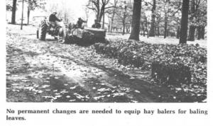 A few miles north of Canton, groundskeepers at Kent State University, Kent, Ohio, have been using a Ford 532 baler to package fallen leaves. They adjusted the chamber feed fork so it barely enters the bale chamber, tightened the flywheel slip clutch to avoid slipping at a reduced pto speed of 300 rpm, removed hold-down fingers from the pickup, and replaced metal pickup tines with rubber teeth for better sweeping action on sod or hard surfaces, such as streets. and parking areas. They also lowered the star wheel, which measures bale length, for more positive engagement with leaves moving through the baler. Power blowers are used at Kent State to gather leaves into piles or windrows prior to baling.