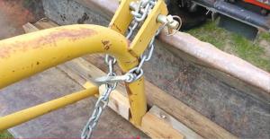 Hook a logging chain to the bucket edge. Run it underneath the bucket, moving from the back side to the top link pin, then back down and around to the front of the bucket edge. Continue with the chain up to, but just below, the top link pin and around it before hooking it back to itself.