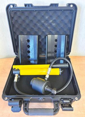 They refined the concept to make it faster and easier. The DRT kit includes dies that match the drum’s curvature, a 15-ton hydraulic ram and a hand pump.