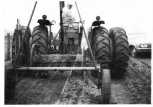 Burdette used an old field sprayer as the basis for the machine. A tripod frame that rises up above the wire spool is used to lift the rolls of wire from the machine with a block and tackle.