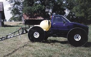 The outer edge of the 4-ft. high wheels are covered by a band of 1 1/2-in. thick rubber. A 110-gal. tank and 40-ft. boom mount on back of the 4-WD pickup.