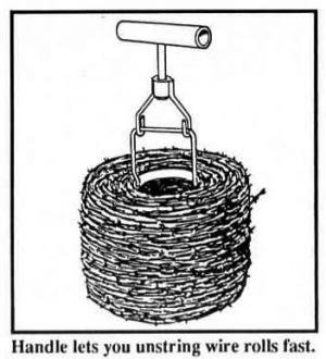 The device makes unrolling wire around trees, and up and down steep inclines, as easy as carrying a small bucket of water. For big rolls of heavy wire, you can slip a short pipe through the handle to make the unrolling a two-person operation. Or, you can attach the "spin free" handle to your pickup or tractor, allowing you to unroll wire right from the driver's seat.
