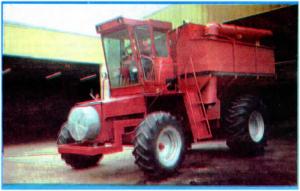 The combine engine mounts behind and the steering axle and the radiator, which is protected by a portion of the subframe that acts as a bumper. A hood for the engine is fabricated out of sheet metal.