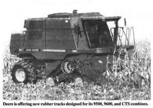 Rubber Tracks For Deere Combines COMBINES Accessories 18-6-27 Deere is offering a new package of high flotation systems that includes rubber tracks designed for its 9500, 9600, and CTS combines, as well as 50-in. wide flotation "logger" tires, high flotation steering tires, and new wide-spaced duals.