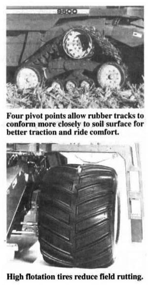 Deere is offering a new package of high flotation systems that includes rubber tracks designed for its 9500, 9600, and CTS combines, as well as 50-in. wide flotation "logger" tires, high flotation steering tires, and new wide-spaced duals.