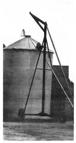 "We use it to put up new grain bins or to increase the capacity of existing bins by adding additional rings," says Wayne Husak, of Neepawa, Manitoba, who along with his father Peter, made a two-wheeled "bin crane" with a boom that reaches 27 ft. high and can handle bins up to 20 ft. in diameter.