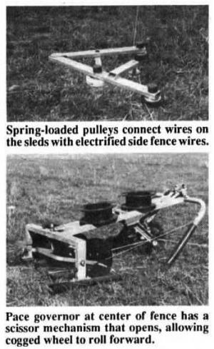 •  A pace governor, or tension regulator located in the center of the frontal fence. It has a scissor mechanism attached to the electric wires coming from both sides. When cattle push on the wire, the tension opens the scissor mechanism, allowing a cogged wheel beneath the sled to roll forward. As soon as tension eases, the scissor mechanism closes.
