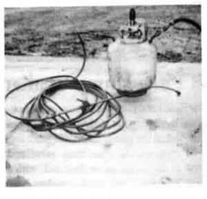 Sonneveld removed the on-off valve from the top of the tank and screwed in a 6-in. long, 3/4-in. dia. fill spout. He drilled a 1/2-in. dia. hole on each side of the top of the tank. In one hole he inserted a length of 1/4-in. dia. pipe down to within an inch of the bottom of the tank. It connects to the 50-ft. air hose. He welded a 1-in. long, 3/8-in. dia. pipe into the other hole and installed a fitting on top of it that allows hookup to an air compressor. To pressurize the tank Sonneveld opens up a ball valve between the fitting and hose. A plug on top of the fill spout prevents air from escaping.