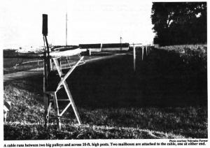 Built by Jack Haiar, Lindsay, Neb., the 800-ft. long mail retrieval system looks like a ski lift. At either end of the system is a big horizontally-mounted pulley. The pulley down by the road is mounted on an old wheel hub attached to a front axle spindle from a car while the pulley up by the house is mounted on a hub attached to a car rear end. A cable runs between the two big pulleys and across 7 10-ft. high posts with 5-ft. crossbars that stand between the farm-yard and the road. There are two mailboxes attached to the cable, one at either end. A 1/ 2-hp. electric motor drives the rear end attached to the pulley up by the yard, bringing up the mailbox from the road and sending out the one from the yard.