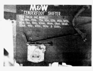 Tenderfoot Shifter TRACTORS Modifications 3-5-5 Tenderfoot Shifter: Coming out this fall from M & W Gear Co. is the Tenderfoot Shifter, a gear box attachment designed to correct shifting problems on IH tractors. The Tenderfoot is a channeled plate that bolts to the tractor gear box and attaches to the clutch pedal. "When the clutch is used, it presses a button on.the plate which essentially locks fluid inside the box, keeping pressure up rather than letting it dissipate," explains a spokesman. "It eliminates most of the common problems, such as not being able to shift at higher rpm's." The device fits IH tractor models listed in the photo and sells as a kit for $199.95. For more details, contact: FARM SHOW Followup, M & W Gear Co., Gibson City, Ill. 60936 (ph 217 784-4261).