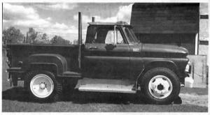 The 2-way hood can be opened front to back like a conventional pickup or flipped up from in front of the windshield. The double-hung hood was necessary to pro-vide easy access to the big engine without changing the looks of the pickup body. The hood and fenders flip forward on a hinge made of pipe fitted about 2 in. above the frame rails.