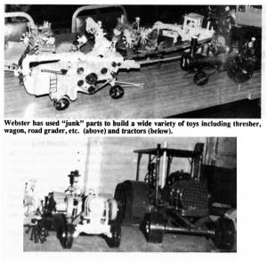 Toy Farm Equiment Made Out Of Junk AG WORLD Ag World 18-2-22 What makes these tractors, combines and other built-from-scratch farm toys unique is that the man who made them, Lyle Webster, Fostoria, Kan., built them entirely out of "junk" parts including nuts, bolts, wire, washers, nails, and scrap iron and tubing.