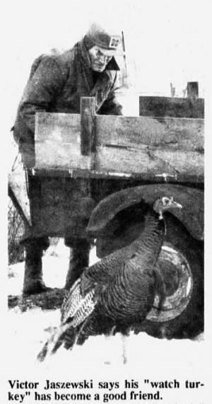 The large turkey "just showed up" last summer, says Jaszewski, a 71-year-old bachelor who's lived more than 40 years on a farm just north of Independence. "I didn't raise it or anything. I don't know if it got dropped off, or was one of those wild turkeys let go, or what. All of a sudden it was here, and no matter what I did, it stayed."