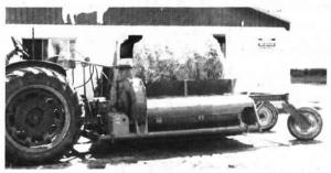 Harold Steel and his sons, Terry and John, modified an old Deere flail chop-per for use as a round bale straw chopper to make straw bedding for their 100-cow free stall barn. The Steels cut off the front half of the hood over the knives, removed the chopper's tongue and pto shaft, and built a frame made from 5-in. channel iron around it. They remounted the wheels onto the right side of the frame. On the left side of the chopper they mounted an 18-in. long pto shaft and a 90 degree gearbox (removed from a New Holland 717 silo blower). The bale rotates on a 7-ft. wide, 3 1/2-ft. long conveyor over a wood floor. They shortened up the chopper spout which blows chopped straw into stalls. The rig is 2-pt. mounted on a Farmall 460 "fast-hitch" tractor.