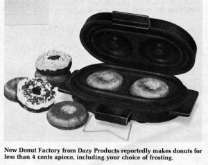 The new Dazey Donut Factory reportedly makes donuts for less than 4 cents apiece, including the frosting. Simple batter requires no special ingredients and can be premixed and refrigerated so you're ready to make hot, fresh donuts any time.