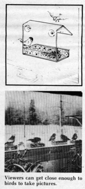 He points out that, since the feeder is made of clear plastic, viewers can get close enough to birds to take pictures with Polaroid or other camera, without having to use special lenses. "The feeder also is virtually squirrel-proof, since they can't climb on slippery glass windows or doors."