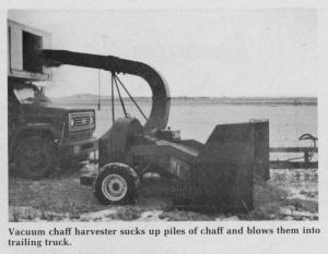 The machine looks like a big snow blower and uses the combination of a pickup reel and vacuum power to pick up the chaff. It's 10 ft. wide and picks up the 600 lbs. piles in 30 to 40 secs. It uses a combination of pto power from the towing tractor and hydraulics to power the vacuum fan, pickup and the blower that loads the chaff into a trailing truck.