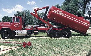 Instead, he traded in one of the pickups for a 1990 Mack tandem axle truck. He paid $40,000 for the truck, $20,000 for the shuttle system, and $8,300 for the liquid manure tank. He had to modify the truck frame so it would accept the frame on the shuttle system, and add a self-contained hydraulic system at a cost of about $2,000. He also paid $3,500 each for a pair of new 22-ft. long garbage hauler truck boxes. One box is 7 1/ 2 ft. high and the other one 5 ft. high. "We use a pull-type chopper pulling a high-dump wagon. We set these two dump boxes on the ground at the end of the field," says Mueller. "We fill one box while the other one is being unloaded. The big box holds 12 to 14 tons while the small one holds 7 to 9 tons. It takes less than a minute to switch boxes."