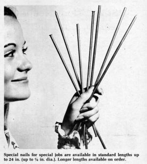 Special nails for special jobs are available from Demby Rod and Fastener Mfg., Berea, Ohio. You can get nails in standard lengths up to 24 in. long and diameters up to 1/4 in. And, if you need them still longer, you can order them custom made to whatever length you need.