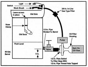 The washer consists of an old enamel sink mounted on top of a 45 gal. barrel. The barrel is about a third full of cleaning fluid. The fluid is pumped out through an outlet pipe near the bottom of the barrel, through a spin-on oil filter (he used a universal remote filter assembly that uses a Fram disposable spin-on filter) and up through an in-line filter to the outlet nozzle in the sink. A wash brush is fitted to the outlet nozzle to help in cleaning parts. Dirty fluid drains out the bottom of the sink and filters through an old sock that's changed often.