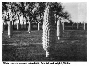 It took about two months to create the 1,500-lb. ears of corn. Three rubber molds with different kernel patterns were used, and the concrete was poured in Dalton, Ga. The ears were shipped to Dublin on three flatbeds. They were erected and painted white last fall.