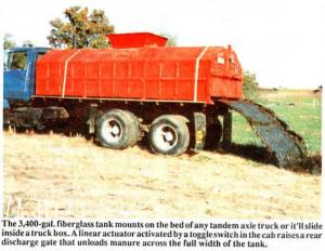 Truck-Mount Fiberglass Manure Spreader Tank MANURE HANDLING Equipment 13-6-36 "My truck-mounted spreader unloads more than twice as fast as a conventional round `honey wagon' spreader and can be hauled at road speeds of 40 to 50 mph. And yet it costs only about half as much," says Jim Off, inventor of the new On "Quik Spred."
