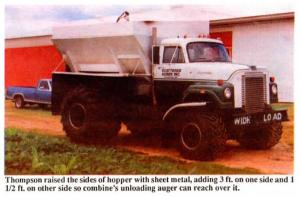 Thompson bought the spreader, powered by a Caterpillar 3208 190 hp engine with a heavy-duty Allison automatic transmission, at an auction for $9,000. He removed the two spinner spreaders on back and replaced them with a 12-in. dia. auger that's powered by a hydraulic motor. He raised the sides of the hopper with sheet metal to boost capacity, adding 3 ft. on one side and 112 ft. on the other side so the combine's unloading auger can reach over it. A belt conveyor at the bottom of the hopper moves grain back into the unloading auger.