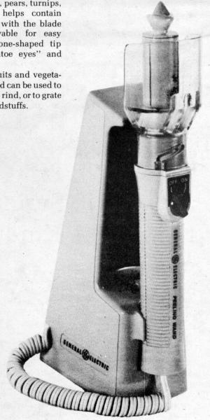 Peels potatoes, carrots, apples, cucumbers, tomatoes, pears, turnips, etc. Starter shield helps contain peelings and, along with the blade assembly, is removable for easy cleaning. Special cone-shaped tip helps remove "potatoe eyes" and other blemishes.